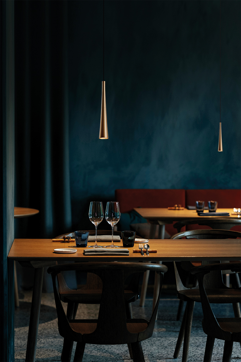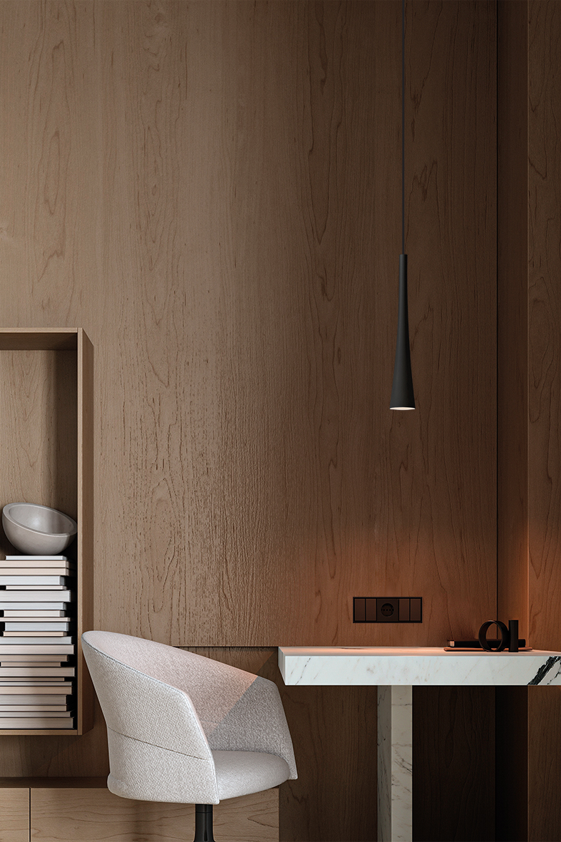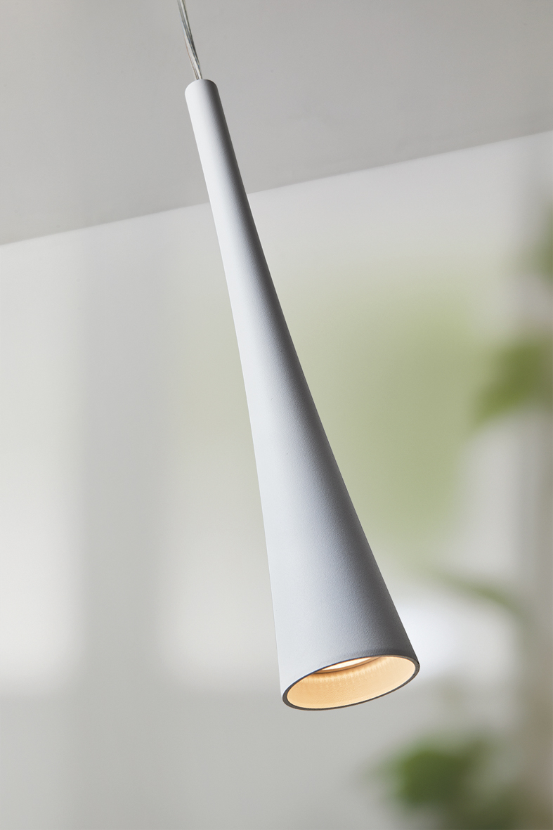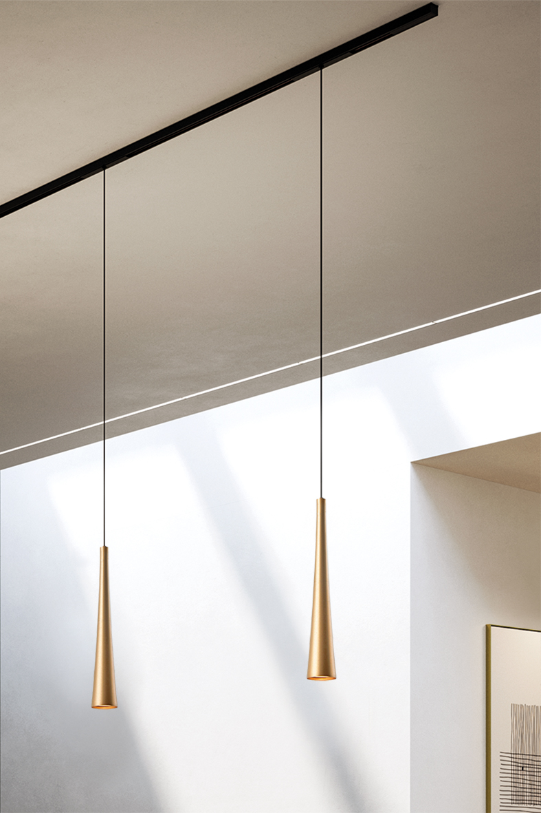 Conical pendant with a softer, fluid silhouette, with a focused light. Available in single, triple linear versions and round ceiling rose with three, five or seven elements. Available also for threephase GROOVE track and monophase SQUASH/SQUASH PRO track.GU10 lamp holder that allows mounting the LED lamp, it is offered in four finishes: white, black, gold and titanium.