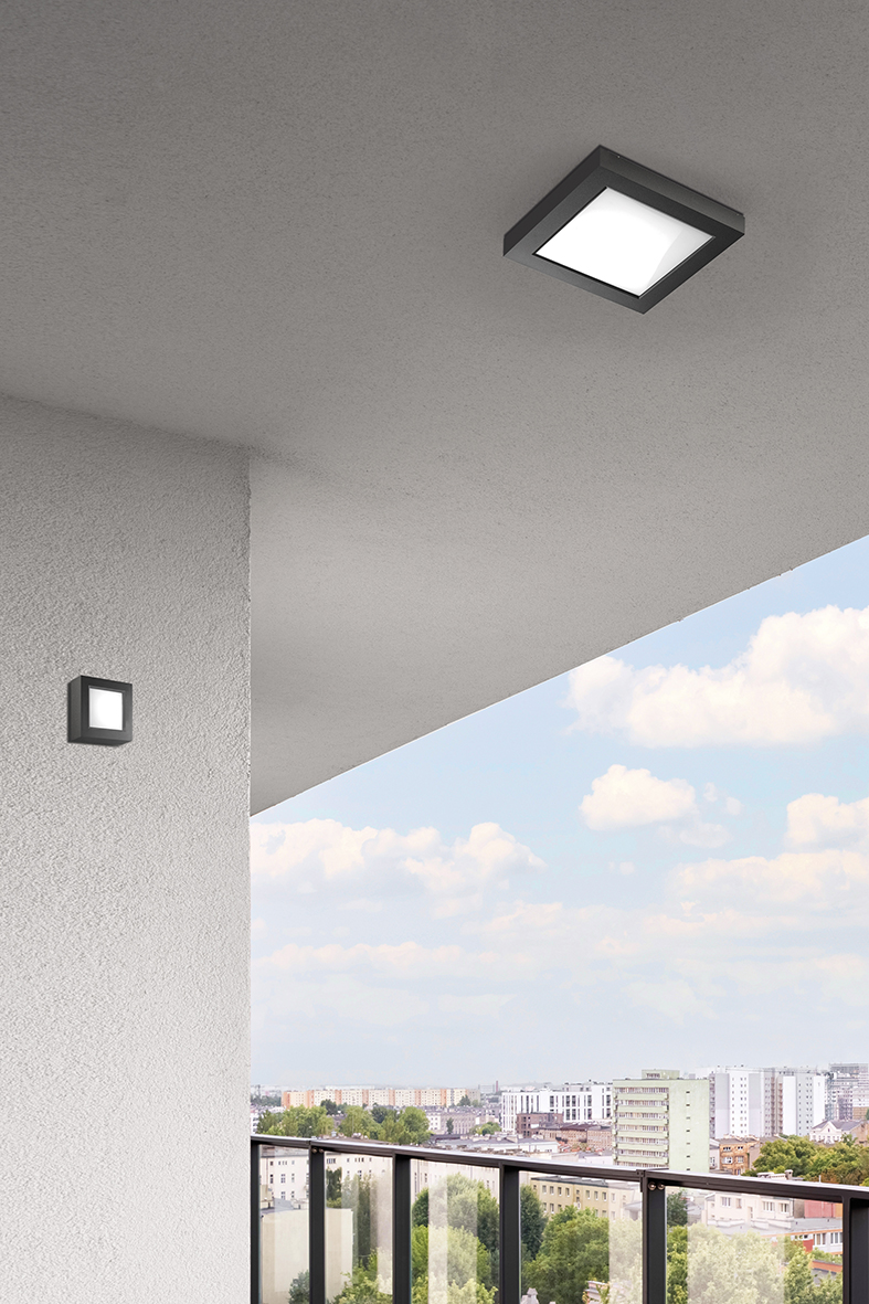 Outdoor (IP65) wall and ceiling LED luminaire. Die-cast aluminium body, painted with polyester powders, highly resistant to UV rays and corrosion: satin tempered glass diffuser. Reflecting aluminium surface, silicone gasket and inox steel screws. Available in square shape, in two sizes and related powers, with two finishes (anthracite and white) and in two gradations (3000K and 4000K). IP68 linear connect ors for moisture protection and anti-condensationlinear joints are available.