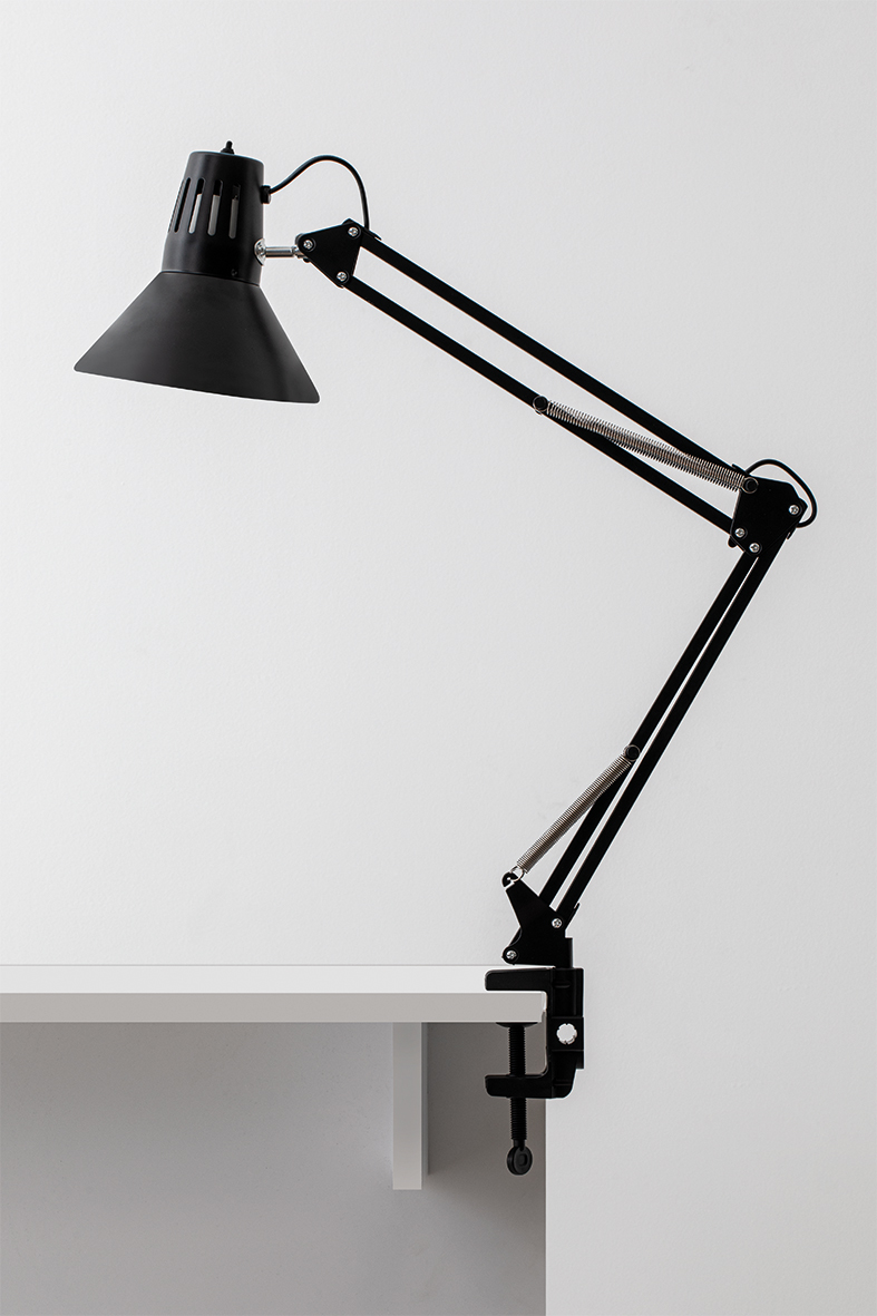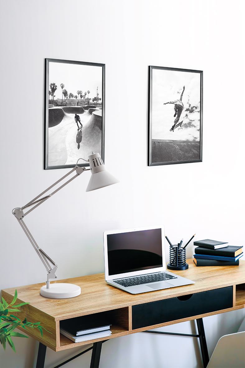 Table lamp with a pantograph arm and adjustable head, directing light exactly where it is needed, with an E27 direct light source. Available in white or black, it is ideal for study, smart working, reading and hobbies. The metal structure features convenient switching directly on the lamp body and offers dual use thanks to the included clamp and support base.