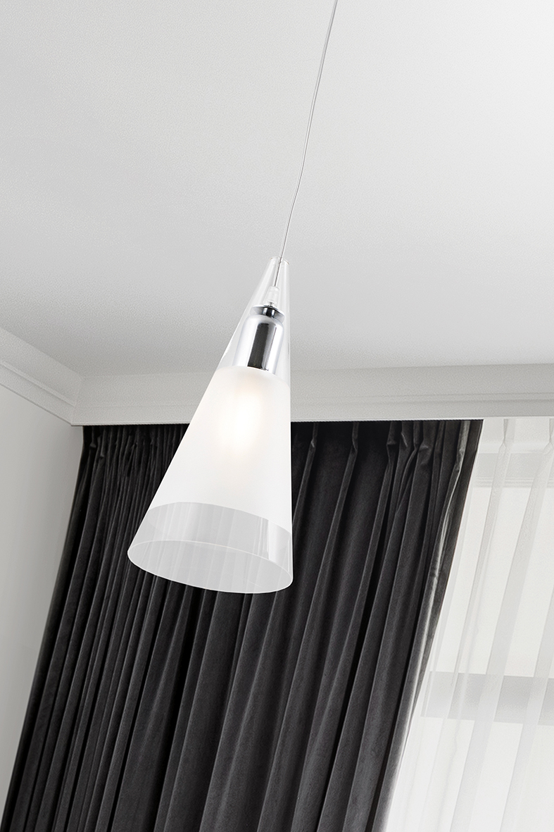 Cone-shaped pendant lamp with diffuser in blown glass with central satin area, covering the light source. Structure and lamp holder in chrome metal. Available in single version, in multiple composition with decentralization kit wih 3 or 5 luminaires, linear ceiling rose with 3 or 4 luminaires. E27lamp holder that allows mounting LED lamp.