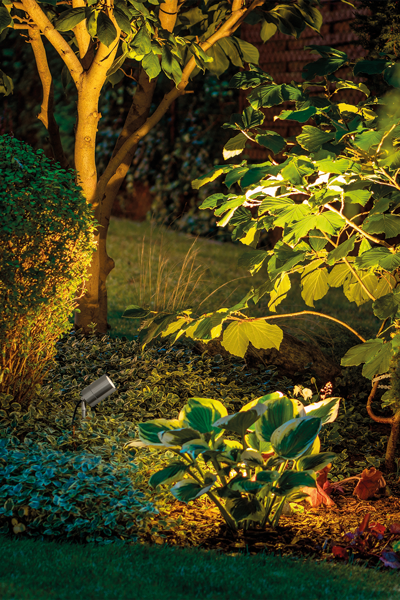 IP65 outdoor adjustable floodlight luminaire, suitable for ceiling, wall and floor mounting with integrated spike. GU10 lamp holder that allows mounting the LED lamp. The structure, made entirely of stainless steel with high weather resistance, is ideal for illuminating flowerbeds, plants, paths, and gardens. Its design allows for quick installation and directing the light beam precisely where needed for precise, high performance illumination.