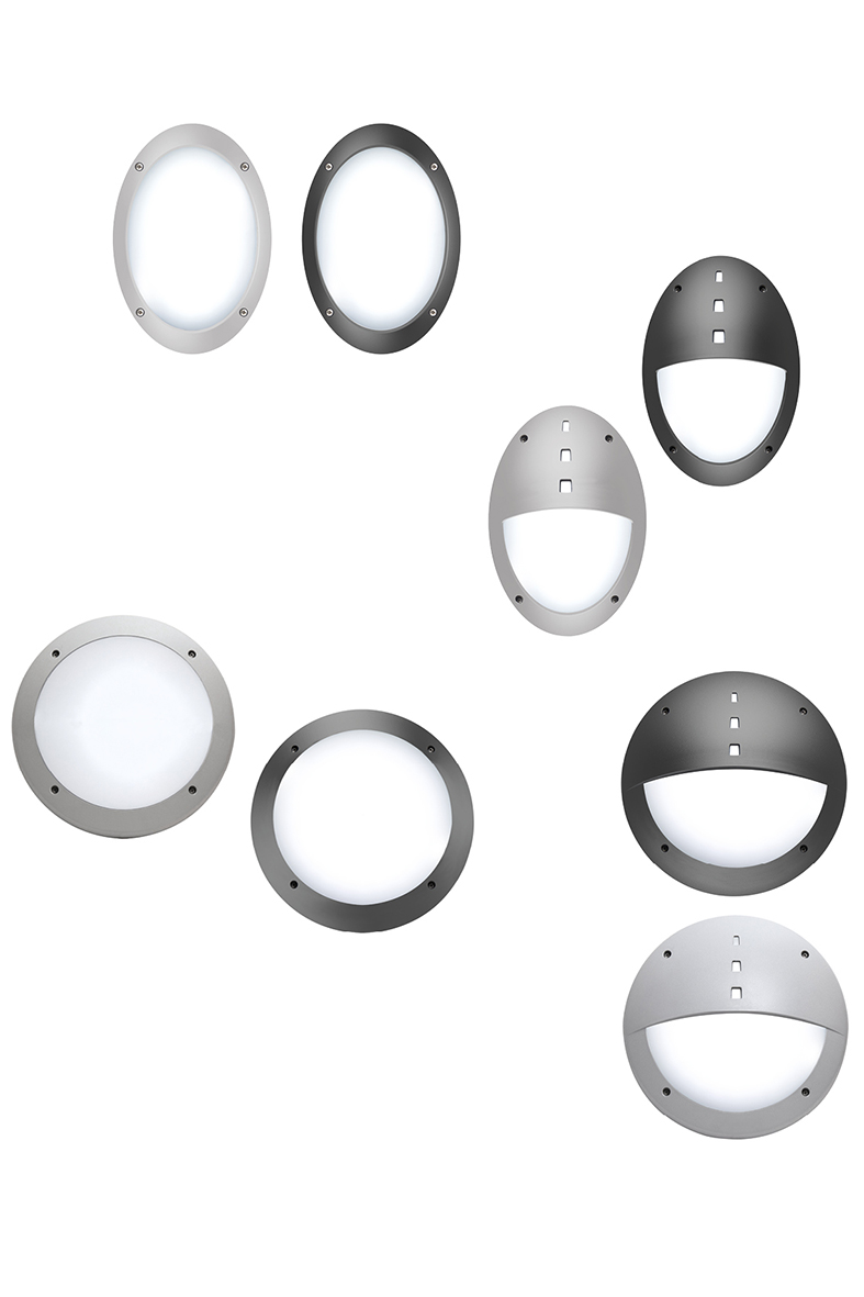 Outdoor (IP66) wall or ceiling luminaire with round or oval shape. Shock-proof polycarbonate body UV-ray stabilized, resistant to rust and corrosion.Available with E27 lamp holder, that allows mounting the LED. Available with full light emission orwith eyelid, in two finishes (grey and black). IP68 linear connectors for moisture protection and anti-condensation linear joints areavailable.