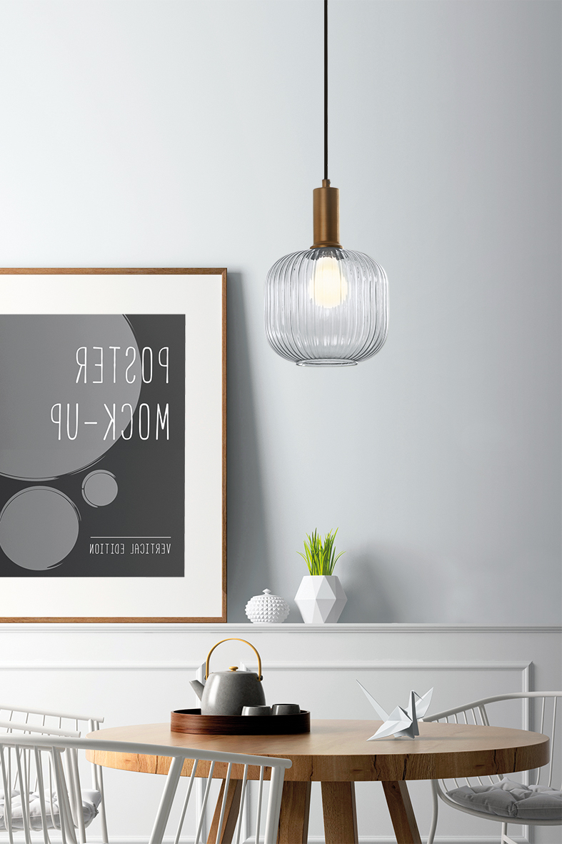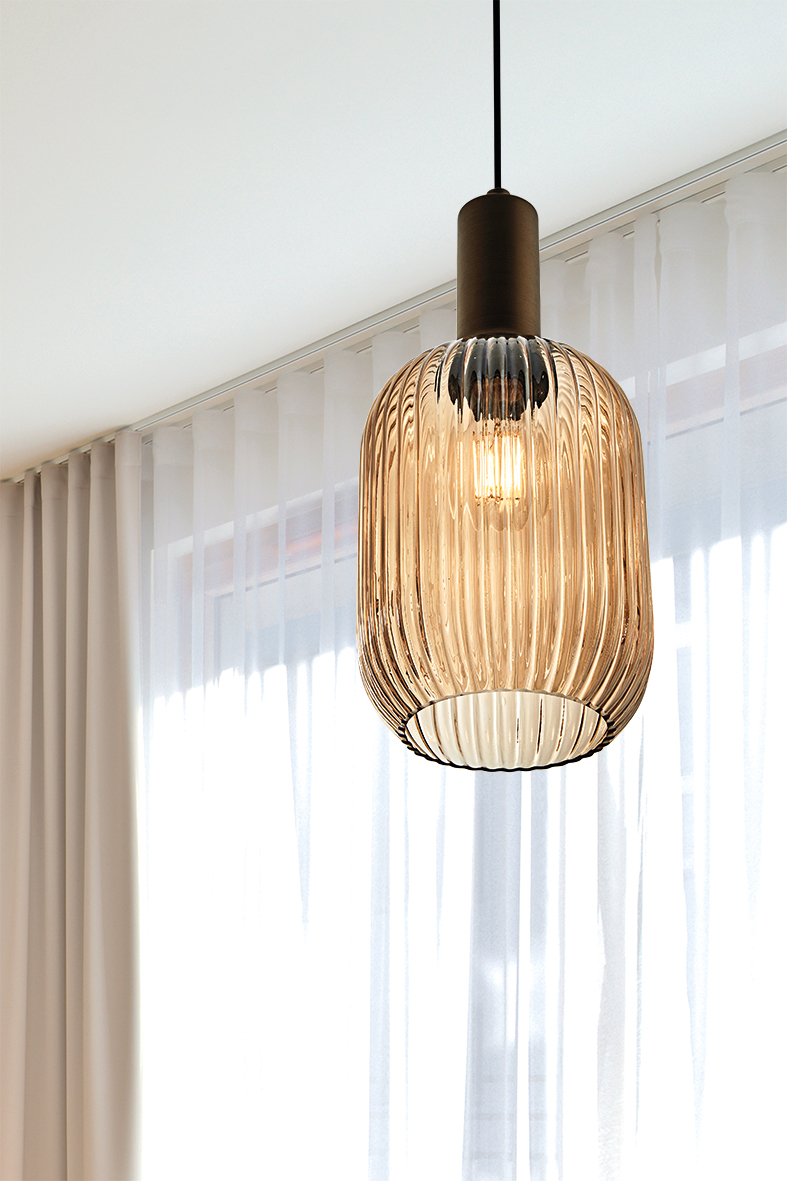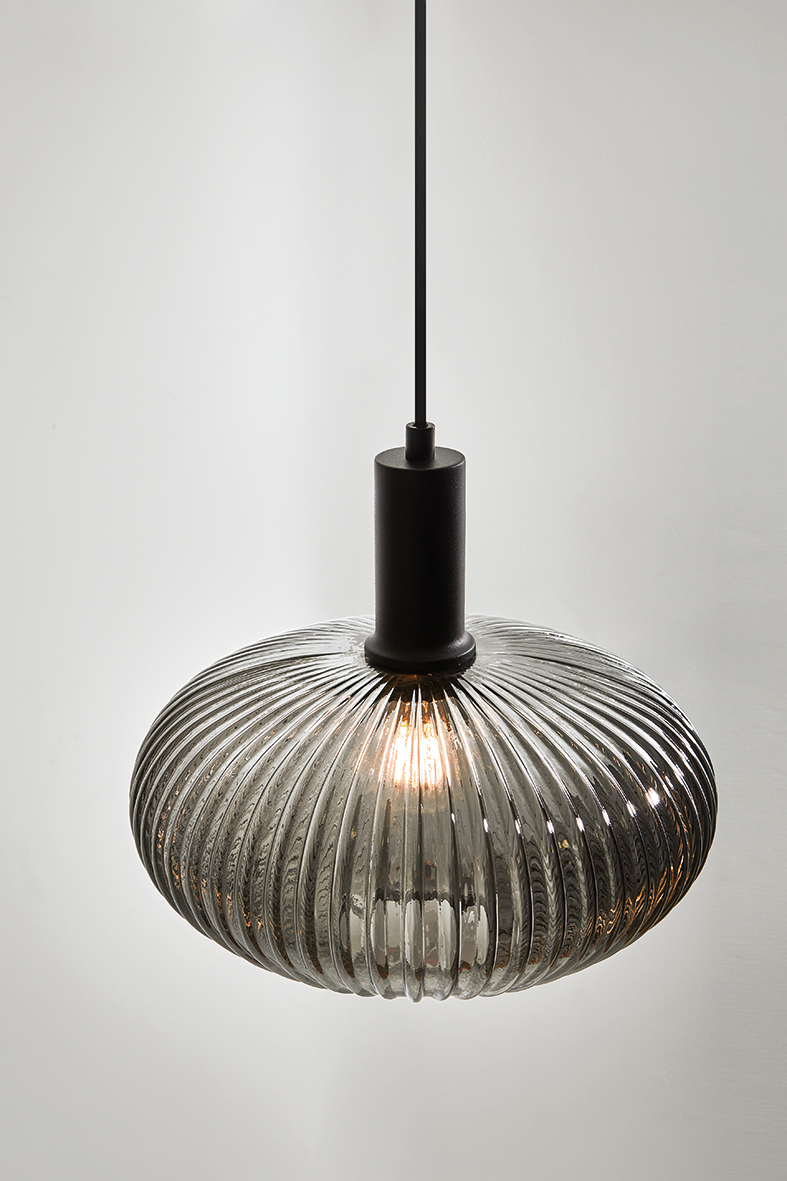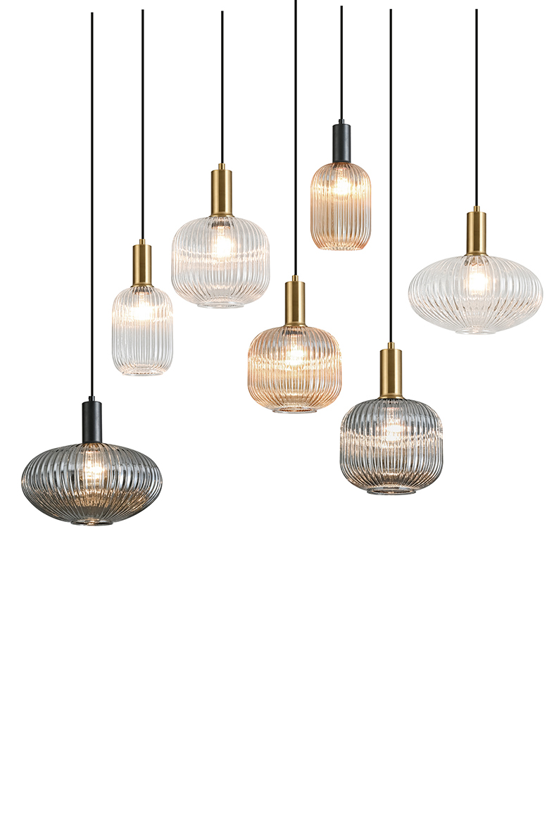 Lampade a sospensione in vetro pensate per arredare con carattere tavoli da pranzo, isole cucina, living e spazi hospitality. Tre forme di paralume e tre tonalità – ambra, grigio e trasparente – disegnano scenari di luce morbida e accogliente. Proposta a caduta singola o con rosone tondo a tre o cinque elementi nella finitura bianco e nero. L’attacco E27 lascia libertà di scelta su potenza e temperatura colore, per cucire l’atmosfera su ogni progetto.
