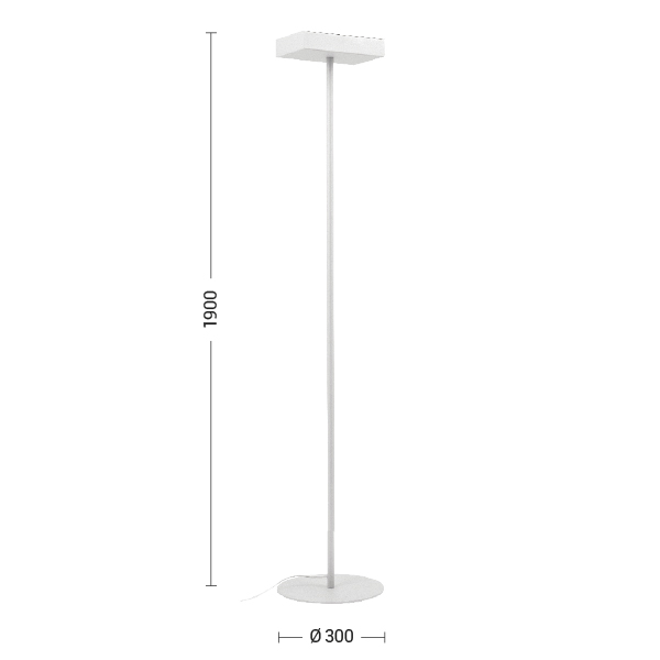 Lampada da terra a luce indiretta con struttura in metallo laccato disponibile in finitura bianca, grigia e nera, dimmerabile. Proposta con quattro portalampada ecavo di alimentazione integrato nellastruttura. Cablata con attacco GX53 che consente di montare lampadina LED.