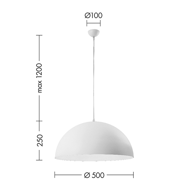 Lampada a sospensione semisfera in metallo verniciato disponibile nei colori bianco (con interno bianco) e nero (con interno bianco o oro). Particolari e rosone in tinta con il diffusore, cavo della sospensione in PVC trasparente. Attacco E27 che consente di montare lampadina a LED.