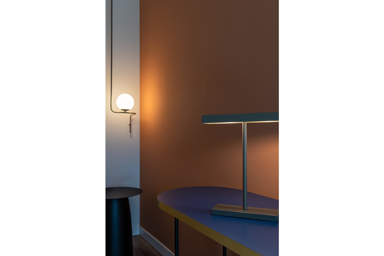 La parola chiave di questo progetto è in assoluto la versatilità, che trova massima espressione nella rivisitazione dell’apparecchio luminoso appena descritto, proposto in una versione con due bracci e due diffusori, progettata appositamente per la suite. Dal design minimale e contemporaneo, l’apparecchio arricchisce e arreda ancora di più la parete su cui è installato ed è in grado di infondere un’illuminazione più intensa grazie al doppio diffusore.